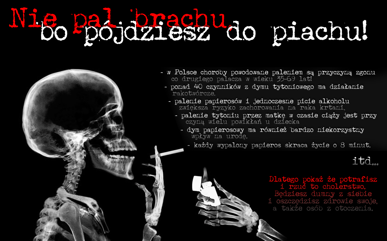 W dniu 06.04.2016r. zostali wyłonieni zwycięzcy w konkursie na projekt plakatu o tematyce antynikotynowej. Konkurs polegał na zaprojektowaniu w programie graficznym plakatu przedstawiającego zły wpływ tytoniu na zdrowie i życie palących. Decyzją jury konkursu miejsce I zajął Paweł Pulik – uczeń klasy IIIE, miejsce II Adam Niewęgłowski – uczeń klasy IIIF. Jury przyznało też dwa wyróżnienia dla uczniów klasy IIIF – Łukasza Adamskiego oraz Jakuba Gadzały. Zwycięzcom serdecznie gratulujemy sukcesów! Konkurs zorganizowały mgr Monika Rączka – pedagog szkolny oraz mgr Monika Kowalik – nauczycielka informatyki.